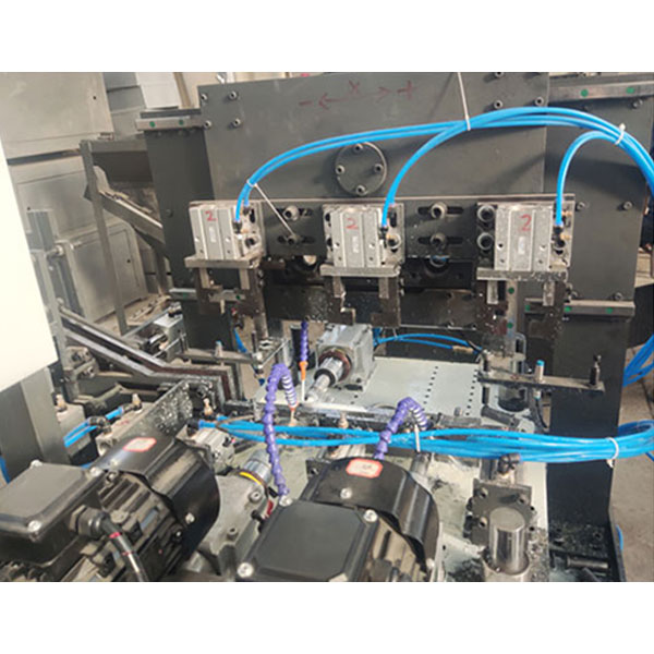 螺栓銷(xiāo)軸-三軸自動(dòng)鉆孔倒角機(jī)的機(jī)器原理及說(shuō)明: 1、本設(shè)備由一個(gè)機(jī)架1100*800*650、3臺(tái)74型氣動(dòng)鉆孔動(dòng)力頭(74型主軸電機(jī)0.75KW,380V行程80MM),500型料斗自動(dòng)送料,3組氣缸夾具的UBOST-CN-PPU機(jī)械手自動(dòng)送料(采用110步進(jìn)電機(jī)+減速機(jī)),水泵、水箱等組成。采用JT6-ER16夾頭。 2、人工將銷(xiāo)軸倒入料斗中,按啟動(dòng)按扭、自動(dòng)送料、自動(dòng)移工位、自動(dòng)夾緊、同步自動(dòng)鉆孔、自動(dòng)對(duì)倒角、自動(dòng)松開(kāi)、自動(dòng)落料。如此自動(dòng)循環(huán)。 3、電源采用三相四線制(三根火線L1、L2、L3,一根零線N)380V/220V,總進(jìn)線采用四芯電纜2.5平方以上;氣源壓力8KG,總進(jìn)氣管直徑為8MM。 螺栓銷(xiāo)軸-三軸自動(dòng)鉆孔倒角機(jī)的優(yōu)點(diǎn)及使用范圍: 1、本機(jī)具有結(jié)構(gòu)合理,操作方便安全可靠,不易斷鉆頭等特點(diǎn); 2、鉆孔效率高。 3、經(jīng)濟(jì)實(shí)用,投入成本低; 4、本機(jī)適用于在銷(xiāo)軸類(lèi)、螺栓類(lèi)、軸類(lèi)、園柱類(lèi)等零件、園柱面上鉆孔;直徑及長(zhǎng)短都可調(diào),屬通用機(jī)型。