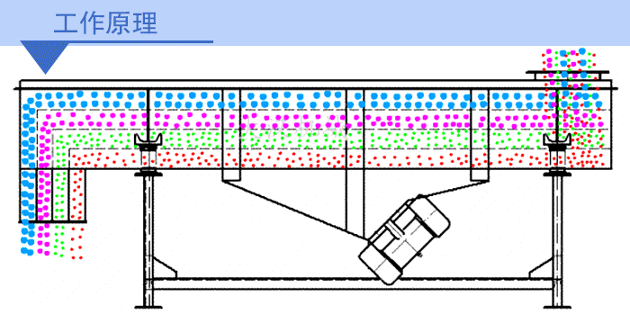 直線振動篩采用雙振動電機驅動,當兩臺振動電機做同步、反向旋轉時,其偏心塊所產生的激振力在平行于電機軸線的方向相互抵消,在垂直于電機軸的方向疊為一合力,因此篩機的運動軌跡為一直線。兩電機軸相對篩面有一傾角,在激振力和物料自重力的合理作用下,進入設備的物料在篩面上被拋起、跳躍式向前做直線型拋物線運動,通過多層篩網產生數種規格的篩上物、篩下物,分別從各自的出料口排出,達到篩選和分級的目的。