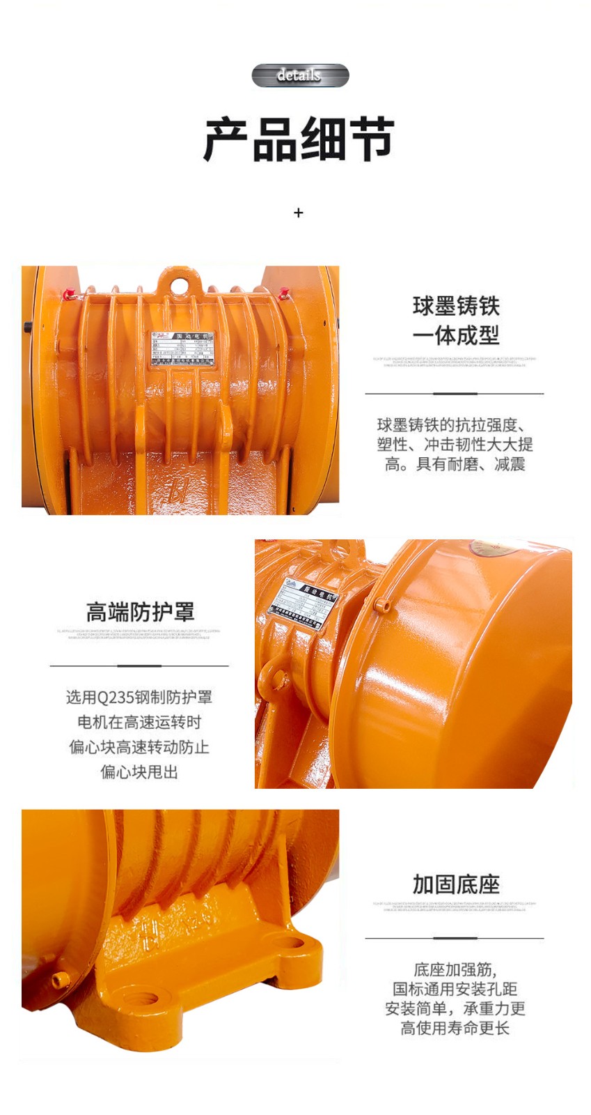 激振力與功率配合得當:具有振動力大,機體重量輕,體積小,機械噪音低的優點,能夠滿足不同振動設備的需求。