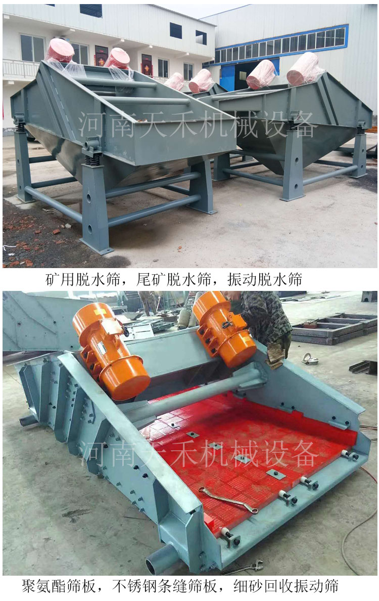 脫水篩,主要作用是脫水、脫泥、脫介,可用于砂石料廠水洗砂、選煤廠煤泥回收、選礦廠尾礦干排等,因此也叫砂石脫水篩、礦用脫水篩、煤泥脫水篩、尾礦干排篩、高頻脫水篩等