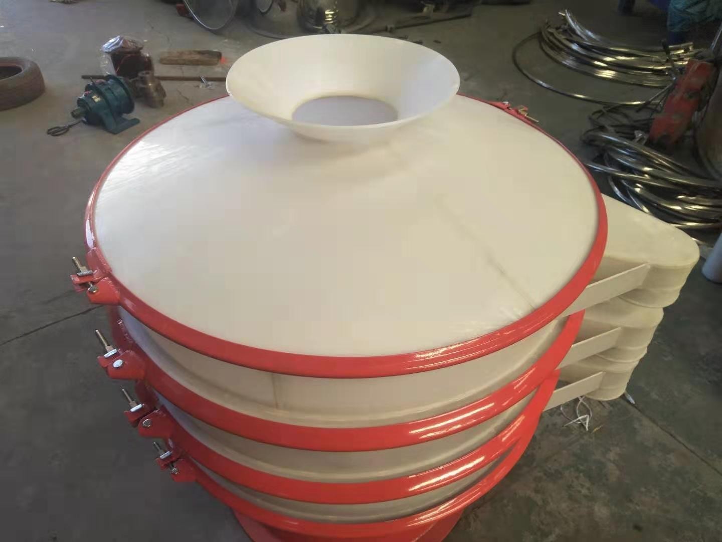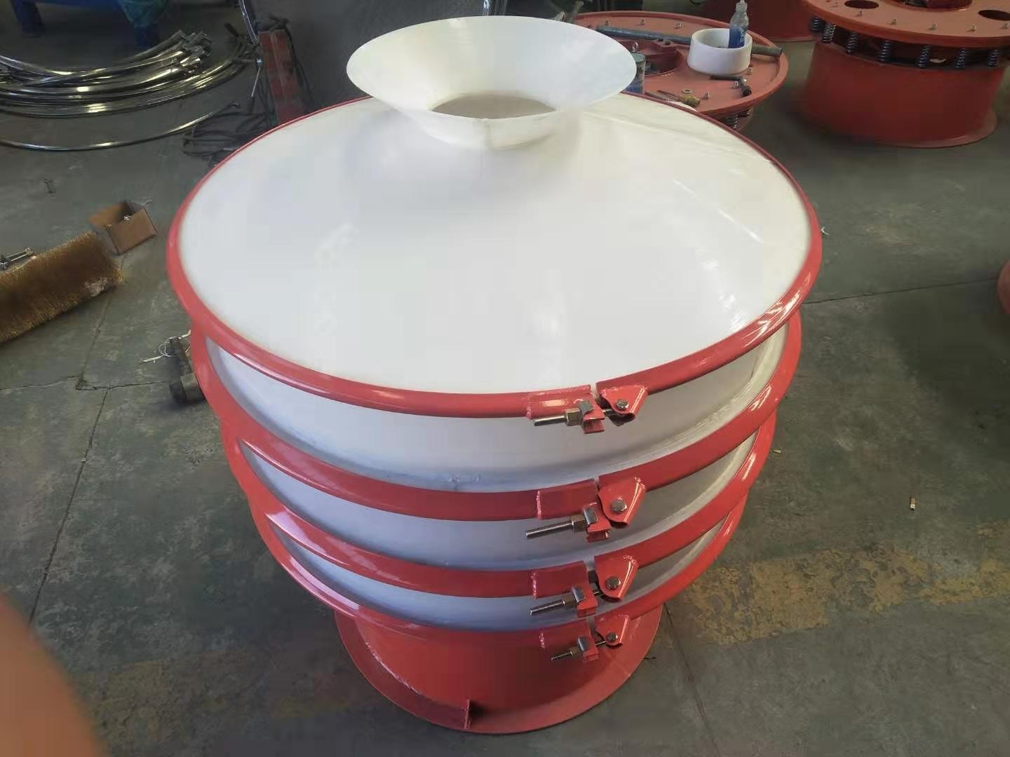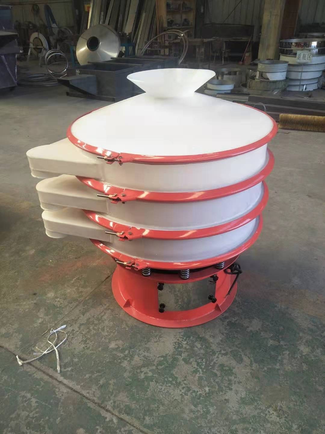 塑料旋振篩采用YZUL立式振動電機作為激振源,通過振動電機上下兩端的偏心重錘將旋轉運動轉變為水平、垂直、傾斜的三次元運動,并傳遞到篩面上;物料通過入口進入設備內,根據不同物料篩分要求,物料經過篩網后采用不同目數的金屬編織網進行分層出料,在這個過程中,位于各層的篩網下的清網裝置(彈跳球)通過頻率振動不斷撞擊篩網,使篩網上側物料能夠順暢的透網篩分,并有效解決了物料堵網現象,不同目數的物料通過各層對應目數的篩網在各層的出料口排出,最終實現篩選除雜或過濾分級的目的。