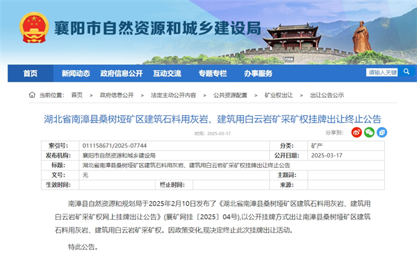 近日,砂石骨料網(wǎng)獲悉,湖北省南漳縣桑樹(shù)埡礦區(qū)建筑石料用灰?guī)r、建筑用白云巖礦采礦權(quán),因政策變化,已終止出讓。該礦保有資源量約3.17億噸,生產(chǎn)規(guī)模500萬(wàn)噸/年,掛牌起始價(jià)為2.38億元。礦山服務(wù)年限60.2年,掛牌出讓年限30年,含基建期1年,采礦權(quán)期限屆滿,登記的開(kāi)采區(qū)域內(nèi)仍有可供開(kāi)采的礦產(chǎn)資源的,可以依法依規(guī)申請(qǐng)續(xù)期。