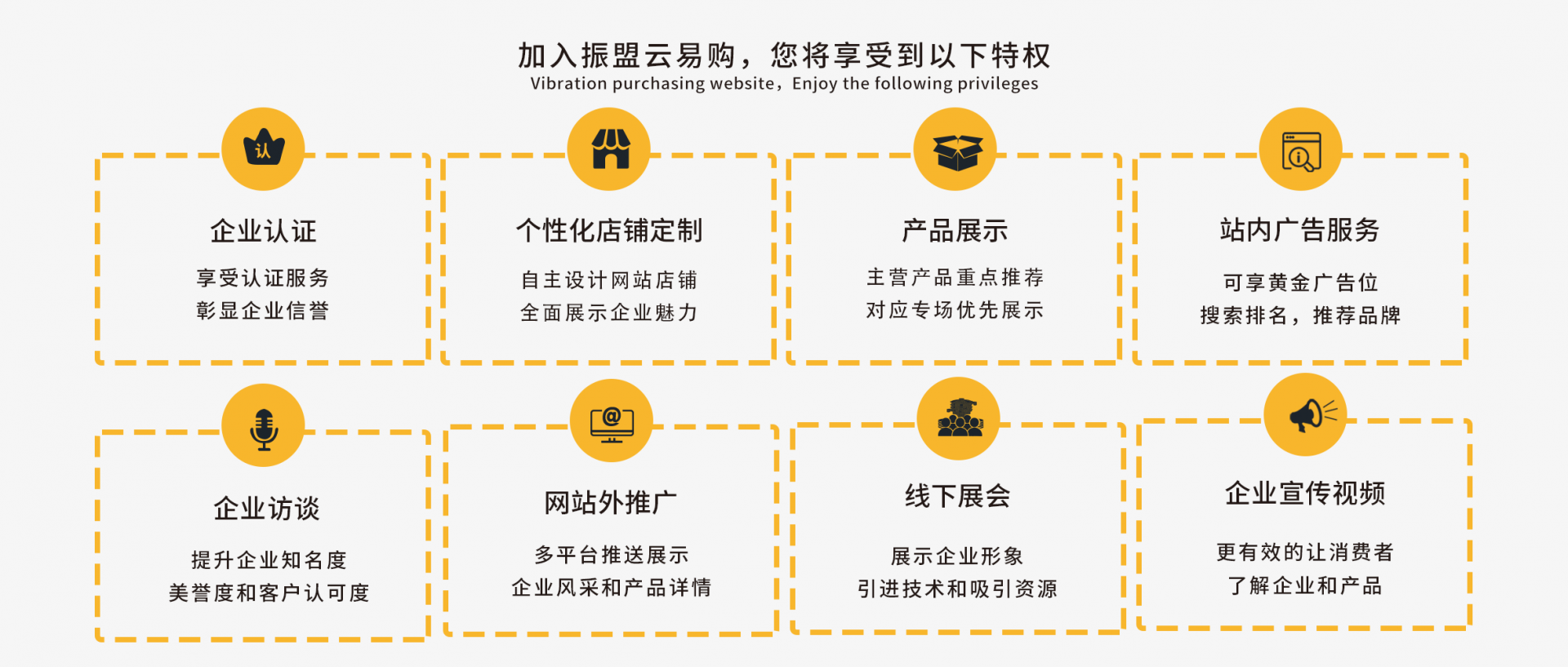 振盟云易購擁有八大特權,全面覆蓋了企業在宣傳、展示、認證、推廣等多方面的需求。企業認證更權威的對企業認可,彰顯企業信譽,全方位展示自身品牌形象、產品特色以及企業實力,讓潛在客戶能夠快速、全面地了解企業。更是企業提升知名度、拓展市場的得力助手。平臺多個頁面設置了不同規格的廣告板塊,精準定位目標客戶群體,為企業的廣告投放提供了理想的渠道。通過企業宣傳視頻,企業能夠在眾多同行中脫穎而出,獲得更多的曝光機會,吸引更多客戶的關注。企業可以在這里獲取最新的行業動態、市場趨勢以及技術創新等信息,為企業的戰略決策提供有力依據。