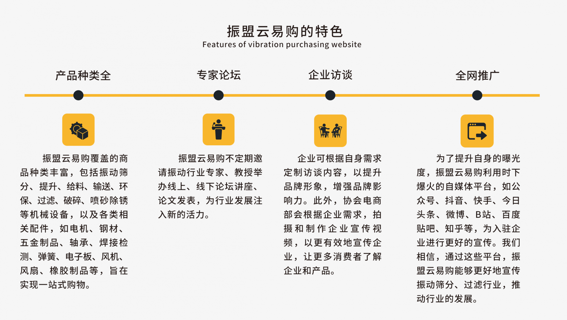 振盟云易購專注于振動篩分、過濾領域生態供應鏈,將上下游產業鏈緊密鏈接在一起。在這里,企業可以實現從設備到配件的一站式采購與銷售。無論是整條生產線、各類振動篩分機械,還是給料輸送等設備及相關配件,平臺都擁有豐富的產品線,真正滿足了客戶的各類需求,實現了一站式購物體驗。這種產業聚焦的模式,不僅提高了采購效率,降低了采購成本,還促進了行業內企業之間的協同發展,形成了一個互利共贏的良好生態環境。