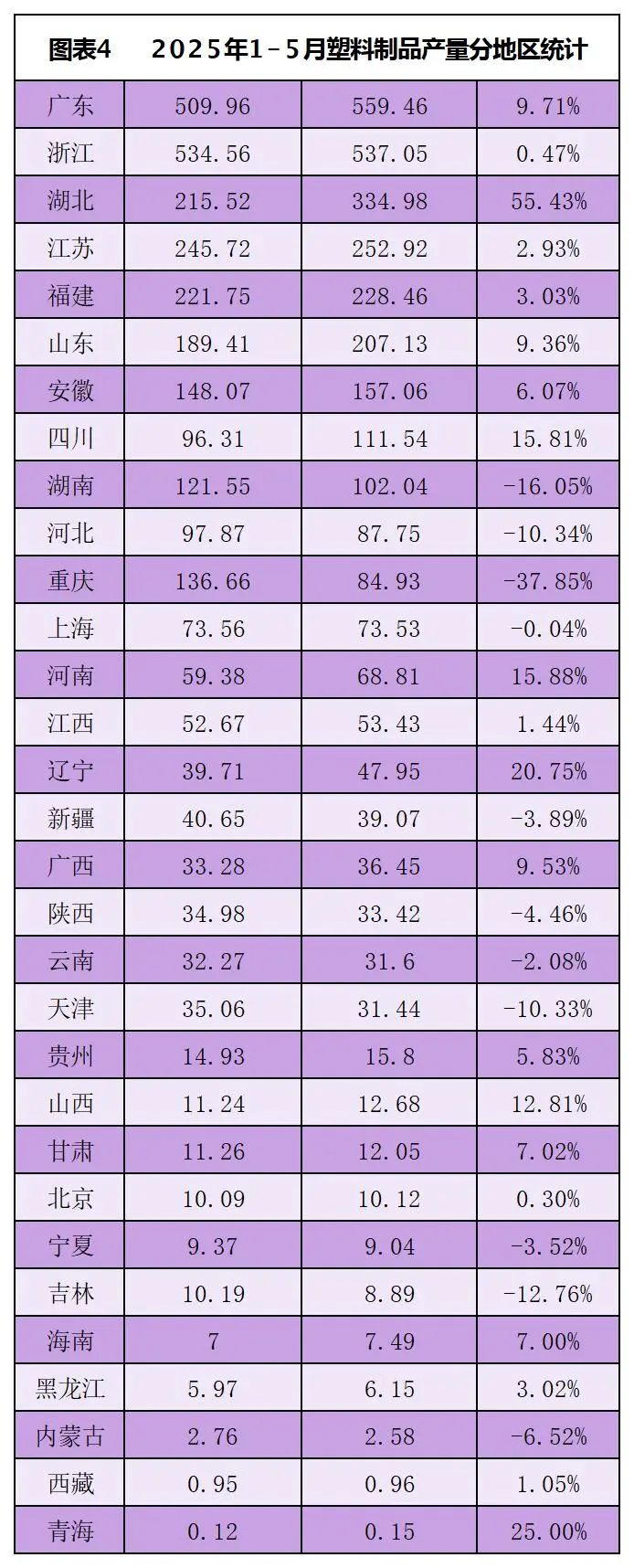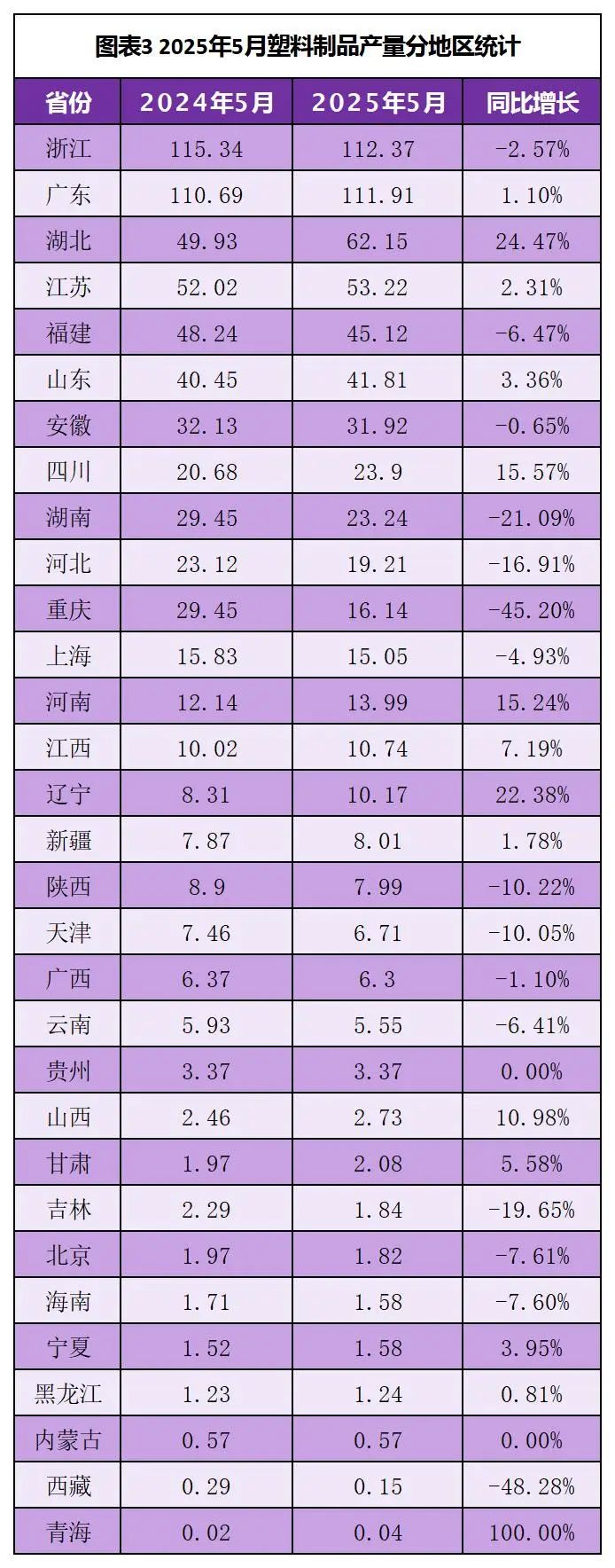 2025年5月,在統(tǒng)計的31個省市中,有13個省市塑料制品產(chǎn)量同比增長,湖北和遼寧增長超過20%。排名前十的省份分別是浙江、廣東、湖北、江蘇、福建、山東、安徽、四川、湖南、河北,總產(chǎn)量524.85萬噸,占全國的81.69%。浙江產(chǎn)量排名第一,產(chǎn)量112.37萬噸,同比下降2.57%。