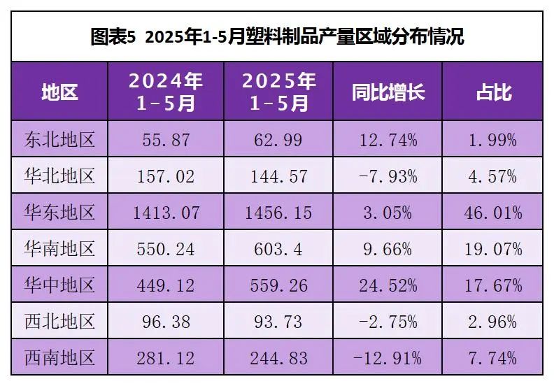 1-5月,華東地區(qū)以1456.15萬噸的產(chǎn)量位居榜首,占總產(chǎn)量的46.01%,顯示出其在塑料制品生產(chǎn)方面的絕對優(yōu)勢。東北地區(qū)產(chǎn)量為62.99萬噸,占總產(chǎn)量的1.99%,是產(chǎn)量最低的區(qū)域。華東、華南和華中地區(qū)合計占總產(chǎn)量的82.75%,是塑料制品生產(chǎn)的主要集中地。