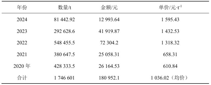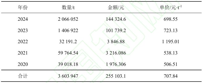 近年來,我國對磷礦進口量大幅增加,價格略有降低。2023年進口量比2022年增加1374.73萬t,增幅達4270.52%;2023年進口量從141萬t增加至2024年的207萬t,增幅達46.85%,進口依賴度增加,磷礦資源保障能力降低。