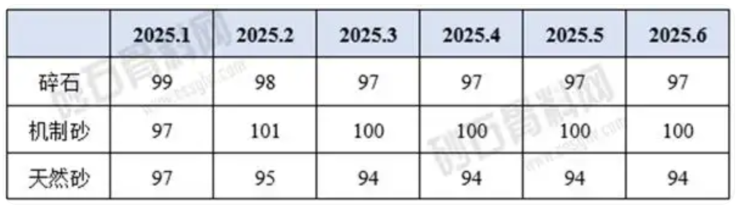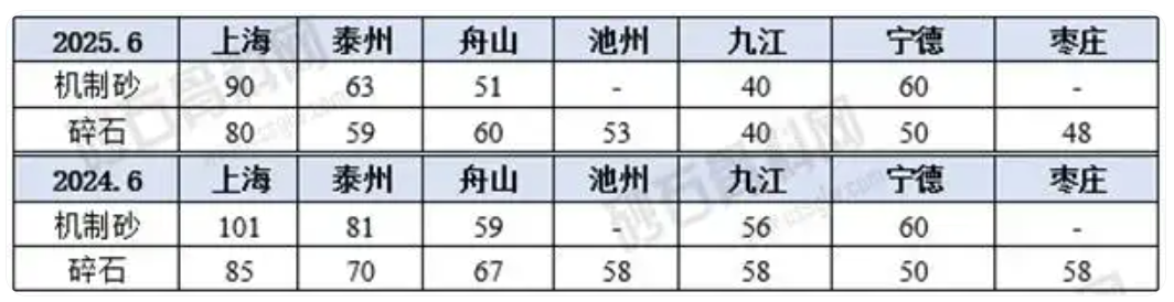 價格端:和2024年6月相比,2025年6月上海、泰州、舟山、九江4地的機制砂以及上海、泰州、舟山、池州、九江、棗莊6地的碎石出廠價均有降,其中九江機制砂、碎石同比降幅最高,分別達28.57%、31%;