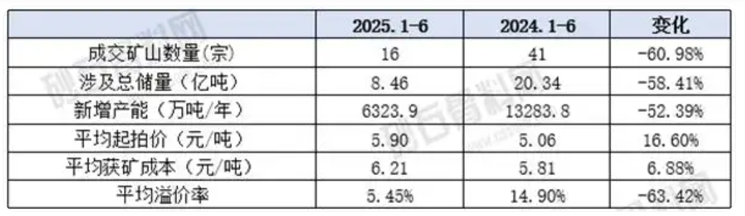 礦山出讓端:1-6月僅成交16宗砂石采礦權,同比銳減60.98%,總儲量8.46億噸、成交52.52億元,新增設計規模6323.9萬噸/年,平均獲礦成本6.21元/噸,供需與資源配置格局正深度調整。