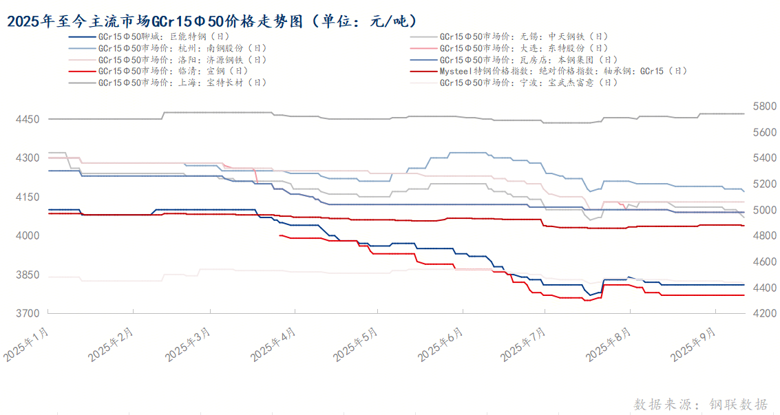 截至目前,GCr15Φ50平均價格為4255元/噸,其中GCr15Φ50(不含興澄特鋼)平均價格為4060元/噸。