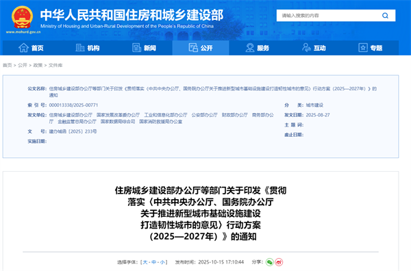 近日,住房城鄉建設部辦公廳等9部門印發《貫徹落實〈中共中央辦公廳、國務院辦公廳關于推進新型城市基礎設施建設打造韌性城市的意見〉行動方案(2025-2027年)》(以下簡稱《行動方案》),旨在推進數字化、網絡化、智能化新型城市基礎設施建設,增強城市風險防控和治理能力。