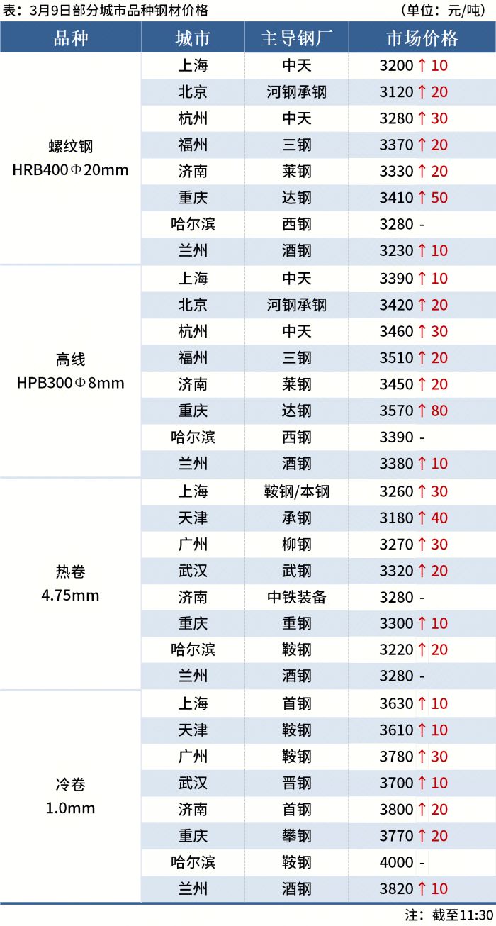 鋼坯:9日唐山鋼坯直發成交一般,倉儲現貨價格報3020-3030含稅出庫,下游成品材價格拉漲20-40,部分品種成交上量,預計午后鋼坯出廠價格或上調30左右。(單位:元/噸)