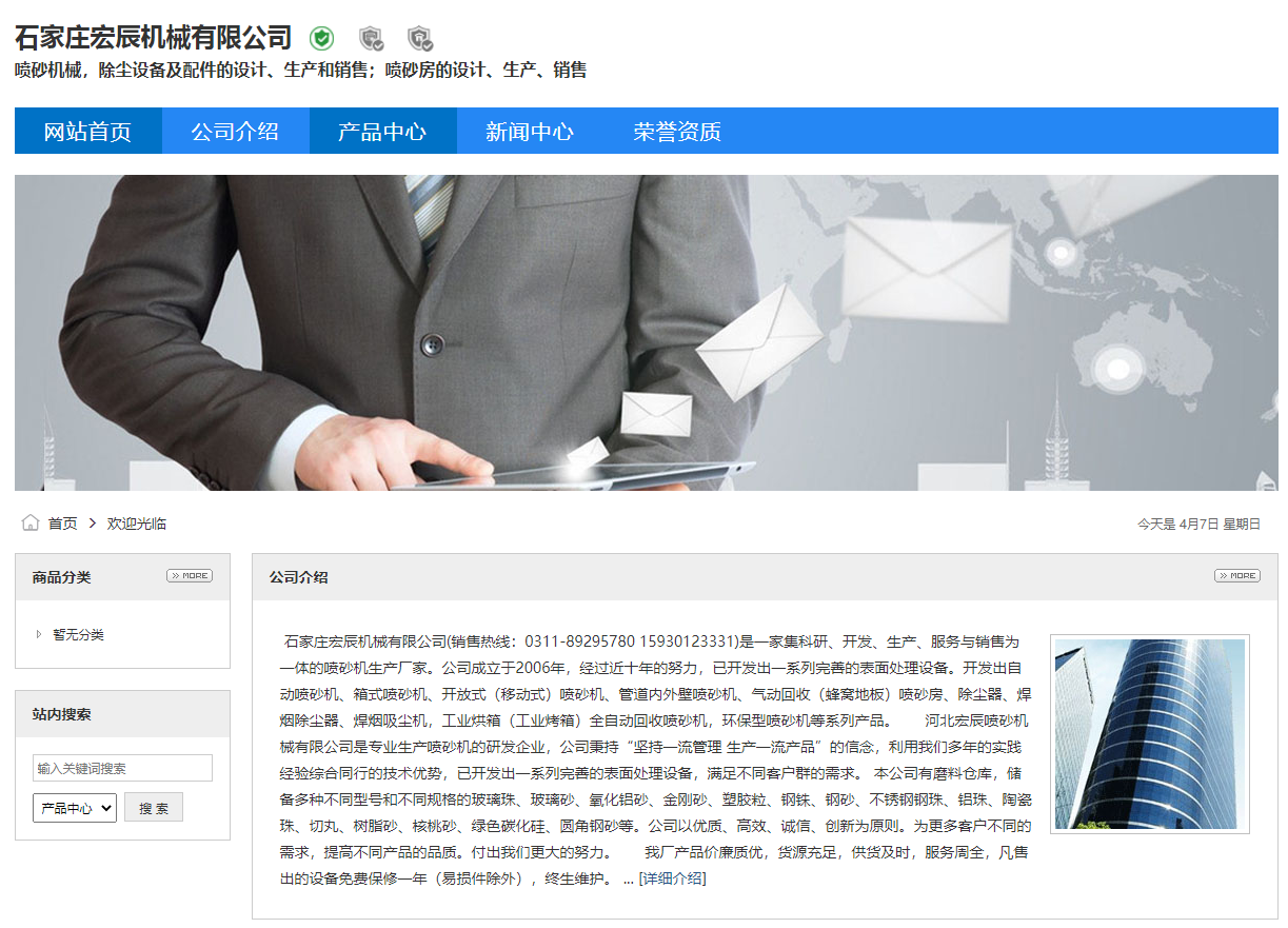 石家莊宏辰機械有限公司,是一家集科研、開發、生產、服務與銷售為一體的噴砂機生產廠家。公司成立于2006年,經過近十年的努力,已開發出一系列完善的表面處理設備。開發出自動噴砂機、箱式噴砂機、開放式(移動式)噴砂機、管道內外壁噴砂機、氣動回收(蜂窩地板)噴砂房、除塵器、焊煙除塵器、焊煙吸塵機,工業烘箱(工業烤箱)全自動回收噴砂機,環保型噴砂機等系列產品。