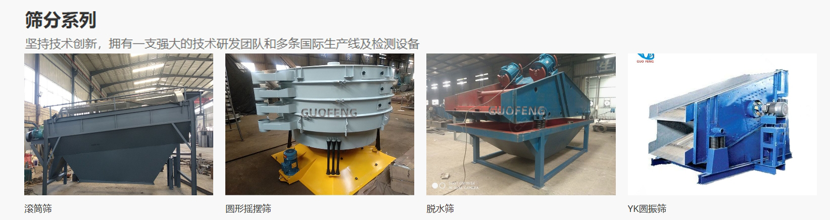 旋振篩、過濾篩、超聲波旋振篩、礦用振動篩、拍擊檢驗篩、氣流篩、直線振動篩等篩分設備;