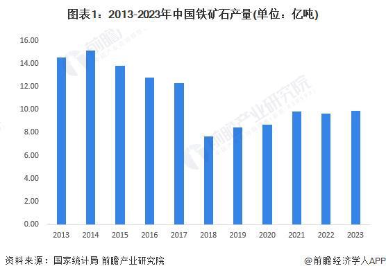 中國是全球最大的鐵礦石進口國。2014年以來,隨著中國宏觀經濟增速放緩,鐵礦石需求明顯下降。根據國家統計局統計,2013-2023年,中國鐵礦石產量先下降后有所上升。2023年中國鐵礦石產量9.91億噸,同比小幅增長。總體來看,中國鐵礦石產量趨于穩定。