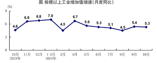 10月份,全國規(guī)模以上工業(yè)增加值同比增長5.3%,環(huán)比增長0.41%。其中,制造業(yè)增加值同比增長5.4%,裝備制造業(yè)增加值同比增長6.6%,高技術(shù)制造業(yè)增加值同比增長9.4%。分產(chǎn)品看,新能源汽車和工業(yè)機器人產(chǎn)量同比分別增長48.6%和33.4%。1月—10月份,全國規(guī)模以上工業(yè)增加值同比增長5.8%,與1月—9月份持平。10月份,制造業(yè)采購經(jīng)理指數(shù)為50.1%,環(huán)比上升0.3個百分點;企業(yè)生產(chǎn)經(jīng)營活動預期指數(shù)為54.0%,環(huán)比上升2.0個百分點。