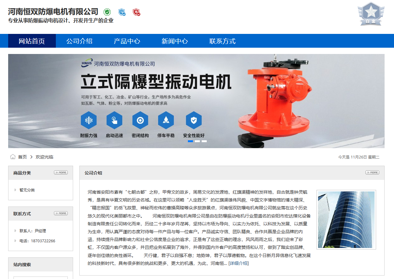 河南恒雙防爆電機有限公司是一家專業從事防爆振動電機設計、開發并生產的企業,是由在行業中負有盛名具有二十多年設計生產經驗的安陽市宏達煤化設備制造有限責任公司轉化而來。企業具有國家防爆電氣產品質量監督檢驗中心、安標國家礦用產品安全標志中心所發放的專業要求嚴格的CCC強制性產品認證、防爆合格證、煤安證、ISO9001:2000國家質量體系認證等相關資質。