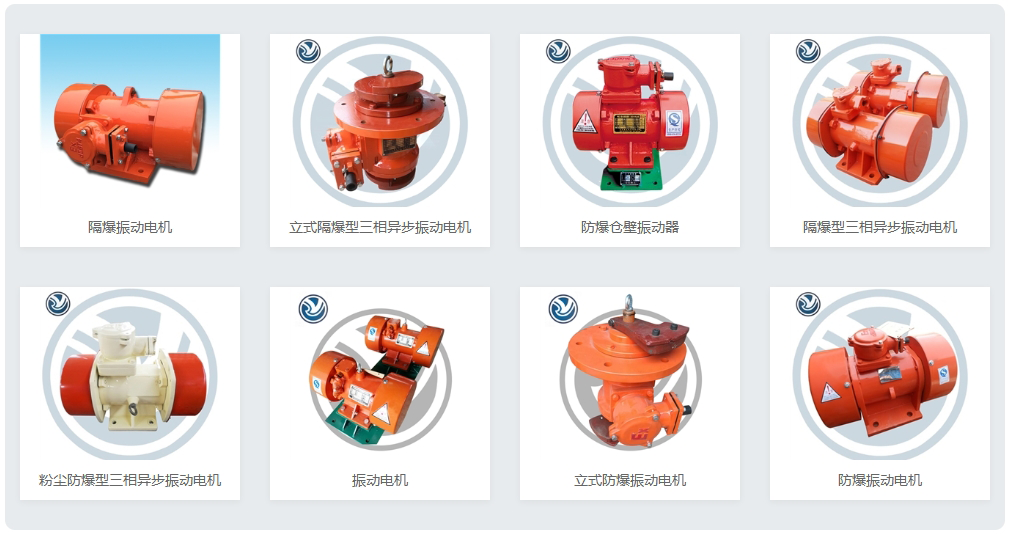 豫北電機公司制造的YZJ系列普通型三相異步振動電機、YBZJ系列隔爆型三相異步振動電機和粉塵防爆型三相異步振動電機、YBZL系列立式隔爆型三相異步振動電機和防爆倉壁振動器分別使用在防爆和非防爆要求的振動機械方面,已廣泛用于煤炭、化工、電力、建材、礦山、冶金、鑄造、石油、糧食等行業,是給料機、振動篩、脫水篩、落料機、輸送機、放礦機,料倉防閉塞裝置等振動機械的激振源。安陽豫北電機有限公司產品具有外型美觀、噪聲低、振動小、運行安全等特點,本公司經過考核認證已取得《防爆合格證》、國家質檢局頒發的《全國工業產品生產許可證》。
